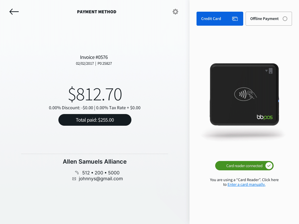 Use a Stripe credit card reader to accept payment in-person. Connect your reader to the app and insert, swipe, or scan cards to accept payment.