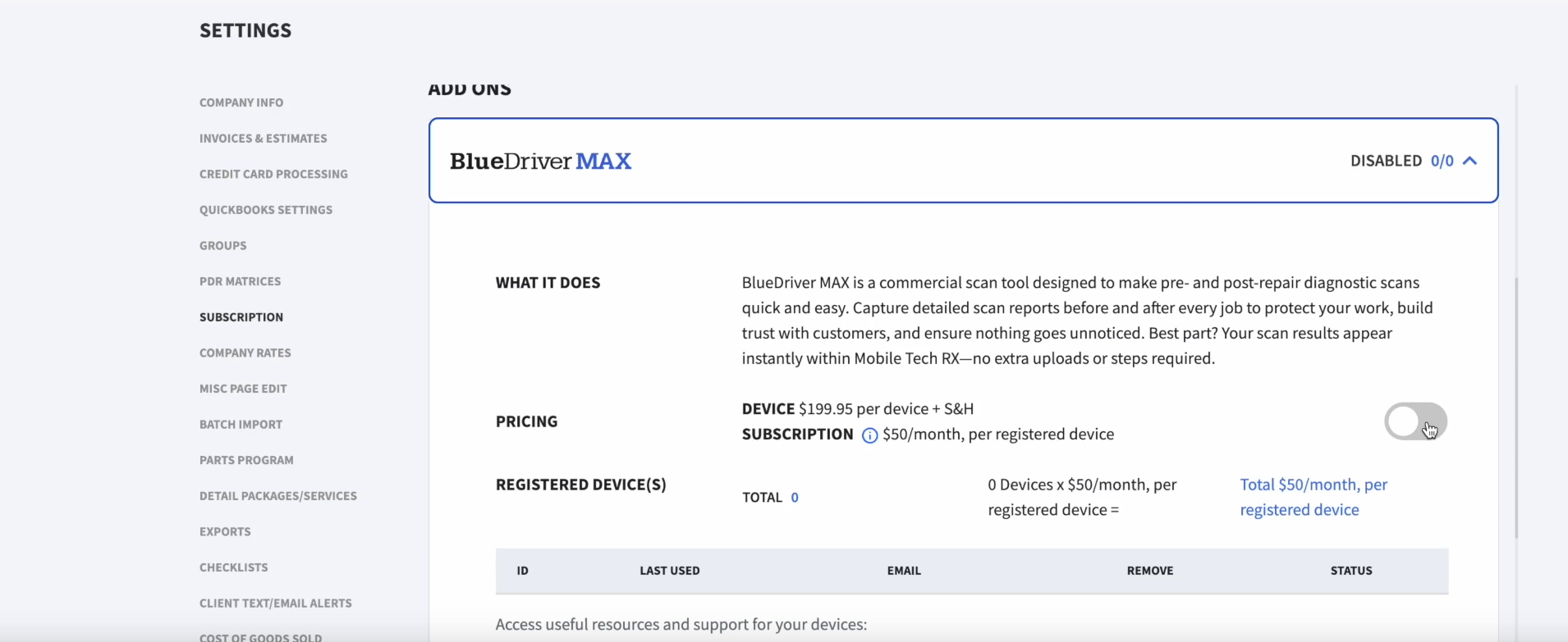 To get started, log in to your Admin Portal at and navigate to the Subscriptions section. Under Add-ons, you’ll find BlueDriver MAX — simply toggle it on to activate your subscription. Note: You won’t be charged until you complete your first scan.